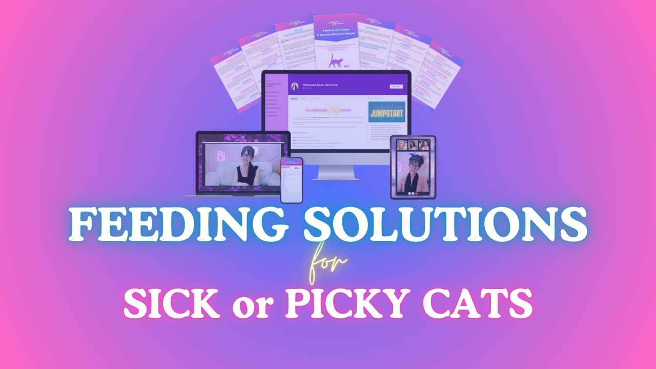 The FEEDING SOLUTIONS for SICK or PICKY CATS (previously called The MEOWSTER CHEF ACADEMY) is for you if you're a caring cat parent who wants to easily, quickly, and affordably provide your furbabies with better food, without confusion, overwhelm, or complicated spreadsheets, especially if they are not quite eating enough.